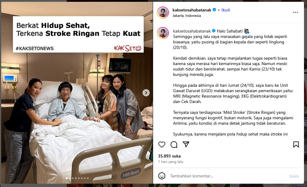 Dalam caption postingan tersebut, Kak Seto menyebut kejadian ini bermula saat dirinya merasakan pusing di bagian kepala dan seperti linglung pada tanggal 20 Oktober 2025. Meski begitu, Kak Seto tetap melakukan aktivitasnya seperti biasanya.