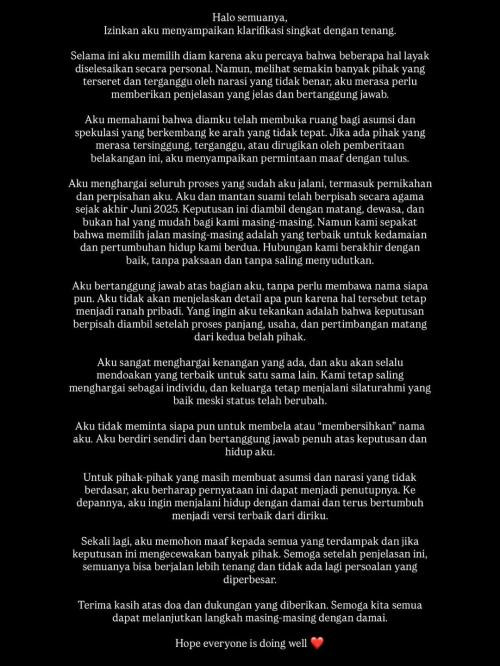 "Semoga setelah penjelasan ini, semuanya bisa berjalan lebih tenang dan tidak ada lagi persoalan yang diperbesar. Terima kasih atas doa dan dukungannya. Semoga kita semua dapat melanjutkan hidup masing-masing dengan damai," tuturnya.