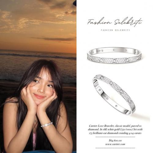 Dalam sebuah foto yang dibagikan Fuji di Instagram miliknya, warganet menyoroti gelang emas putih yang dipakainya. Diketahui gelang tersebut masuk ke dalam seri Love Bracelet dari Cartier dengan 10 butir berlian seberat total 4.04 karat. Gelang dengan model klasik itu pertama kali diperkenalkan Cartier di New York, pada 1969.