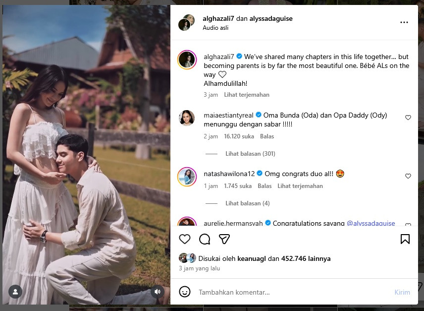Kabar kehamilan Alyssa Daguise ini dikabarkan langsung oleh Al Ghazali di laman Instagram dalam sebuah video manis yang berlatar di sebuah peternakan kuda. Pasangan itu tampil serasi dalam balutan busana berwarna krem.