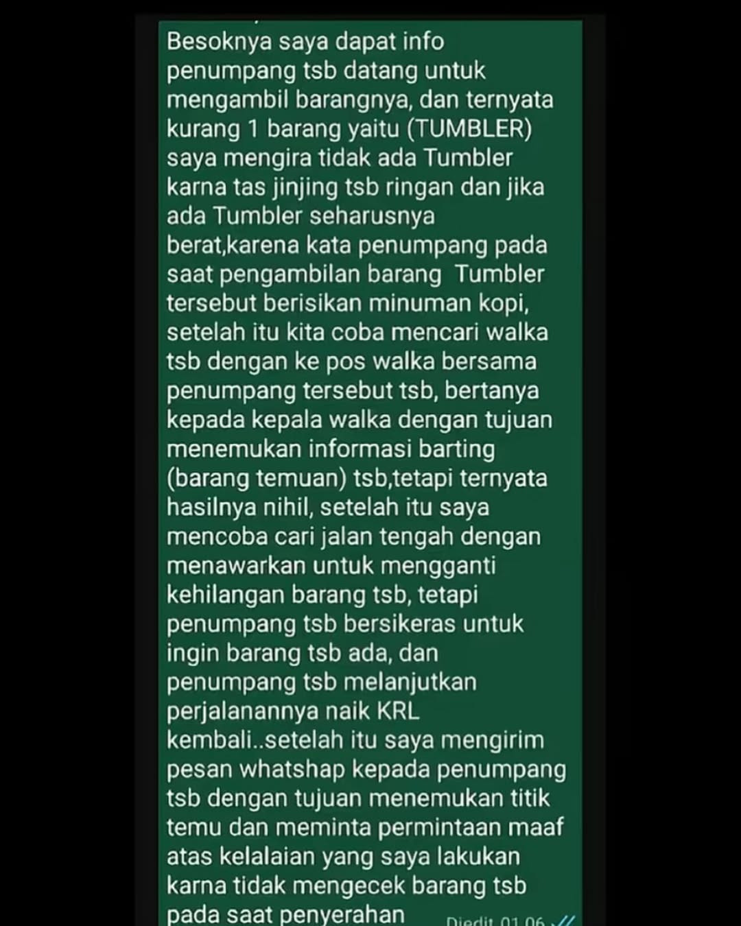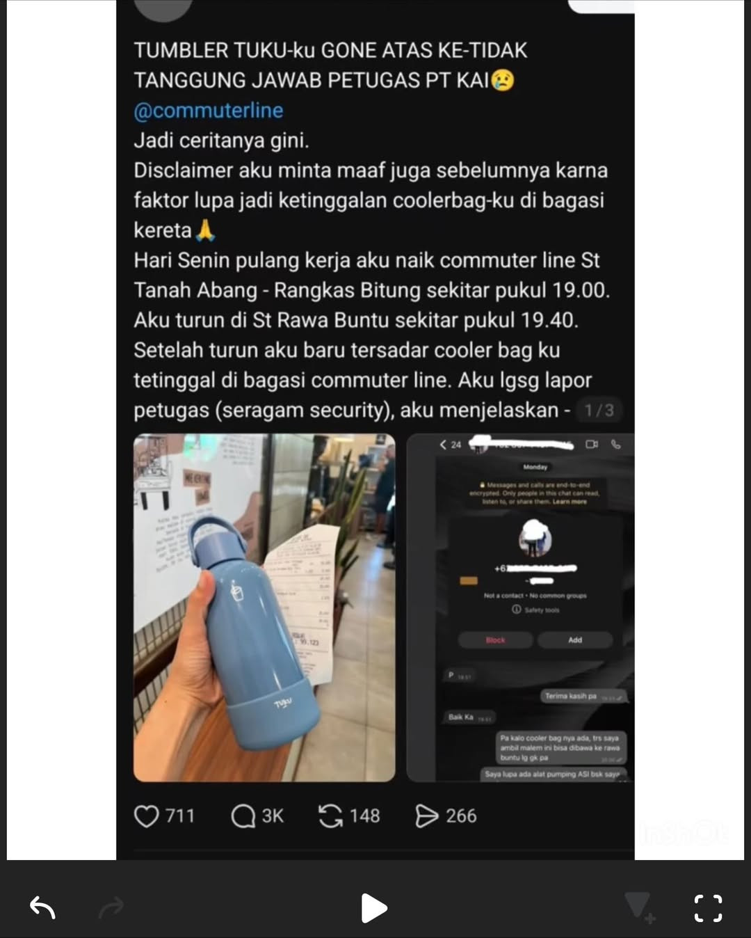 Setelah melapor kepada petugas, cooler bag tersebut berhasil ditemukan oleh satpam PT KAI bernama Argi dan bahkan sempat didokumentasikan lengkap. Rupanya, saat Anita mengambil barang tersebut di Stasiun Rangkasbitung, dia terkejut karena isi tas, yakni tumbler Tuk* ternyata sudah hilang.