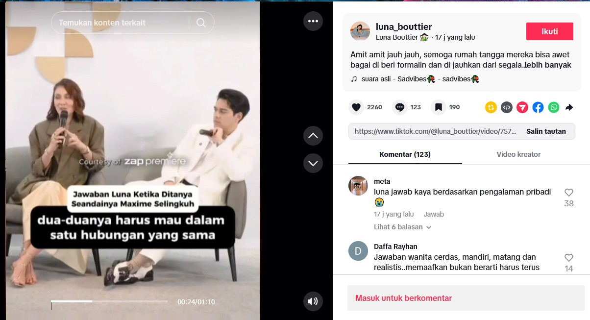 "Pertama ya harus refleksi dulu. Kenapa, gitu? Kalo gak ada alesan ya mungkin kitab isa cari solusinya gitu. Mau apa? You still want to continue dengan perempuan itu atau enggak. Gitu sih. Kalopun jawabannya iya, ya silahkan. Kan sebuah hubungan dua-duanya harus mau dalam satu hubungan yang sama," ujar Luna Maya, dikutip dari TikTok @.luna_bouttier.