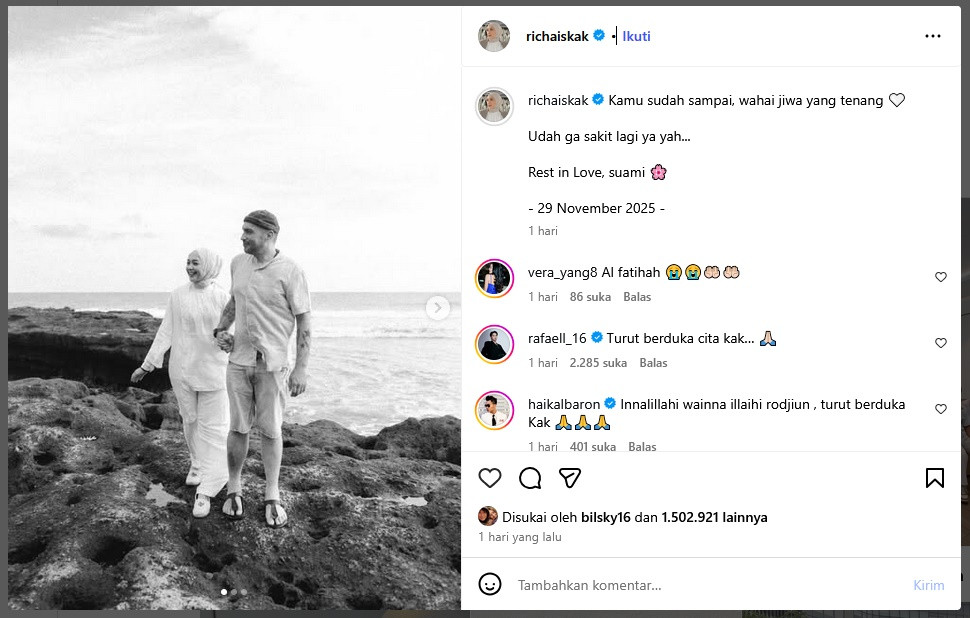 "Kamu sudah sampai, wahai jiwa yang tenang. Udah ga sakit lagi ya yah. Rest in Love, suami," tulis Richa, Minggu (30/11/2025).
