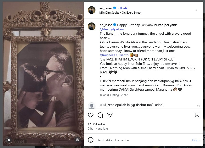 Unggahan tersebut juga berisikan harapan untuk Ari Lasso agar Dearly Joshua agar Tuhan selalu memberkati dan memberikan umur panjang dan kehidupan yang baik di usia sang kekasih yang baru.