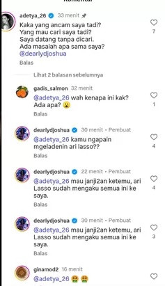 Dalam lanjutan komentarnya, Dearly Djoshua juga membeberkan bahwa Ari Lasso dan perempuan itu janjian untuk bertemu. Hal itu menurut Dearly, sudah dibenarkan oleh mantan kekasihnya itu. Namun pemilik akun @adetya_26 itu tak terima dan menilai, Dearly Djoshua tak pantas mengancamnya dan sikap tersebut memiliki dampak hukum. (ND)