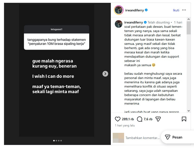 "Gua malah ngerasa kurang euy, beneran. I wish i can do more. Maaf ya teman-teman, sekali lagi minta maaf," balas Ferry Irwandi.