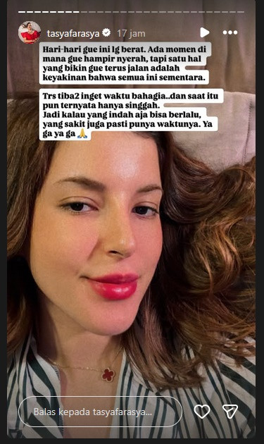"Ada momen di mana gue hampir nyerah, tapi satu hal yang bikin gue terus jalan adalah keyakinan bahwa semua ini sementara. Terus tiba-tiba inget waktu bahagia..dan saat itu pun ternyata hanya singgah. Jadi kalau yang indah aja bisa berlalu, yang sakit juga pasti punya waktunya," tulis Tasya Farasya.