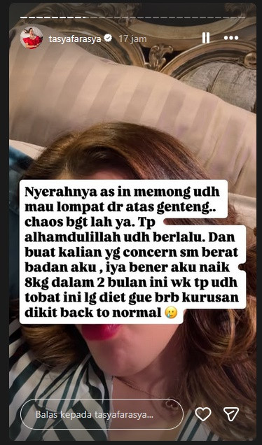"Nyerahnya as in memong udah mau lompat dr atas genteng.. chaos banget lah ya. Tapi Alhamdulillah udah berlalu. Buat kalian yang concern sama berat badan aku, iya bener aku naik 8 kg dalam 2 bulan ini wkwk tapi udah tobat ini lagi diet gue brb kurusan dikit back to normal," kata Tasya, di unggahan lain.