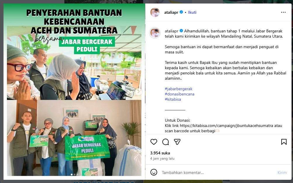 "Alhamdulillah, bantuan tahap 1 melalui Jabar Bergerak telah kami kirimkan ke wilayah Mandailing Natal, Sumatera Utara. Semoga bantuan ini dapat bermanfaat dan menjadi penguat di masa sulit," tulis Atalia Praratya.