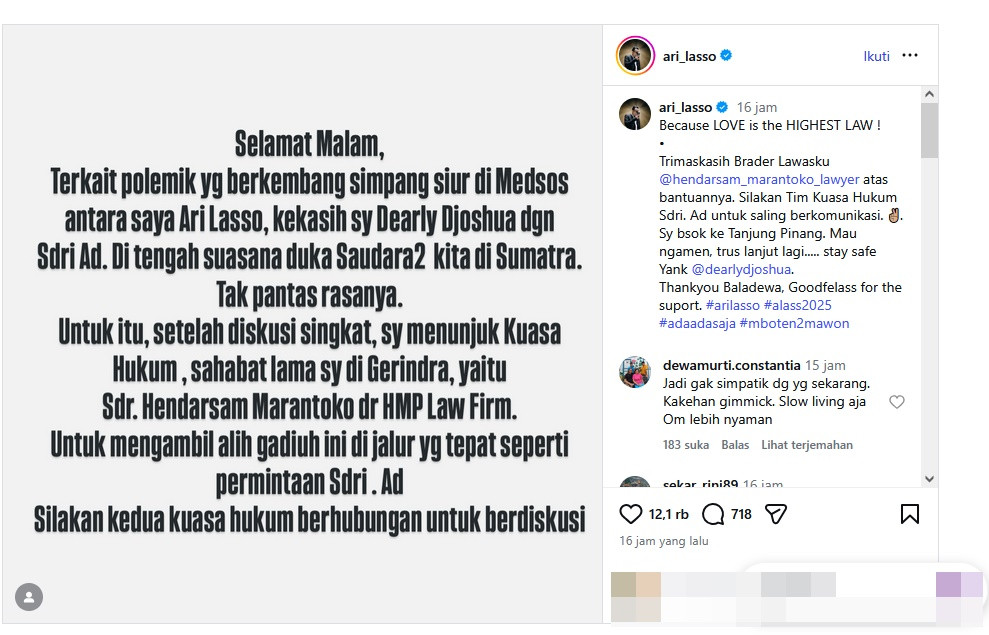 "Terkait polemik yang berkembang simpang siur di media sosial antara saya, Ari Lasso, kekasih saya Dearly Djoshua, dan Saudari Ad. Di tengah suasana duka saudara-saudara kita di Sumatra, tak pantas rasanya," tulis Ari Lasso, melalui unggahan di Instagram.