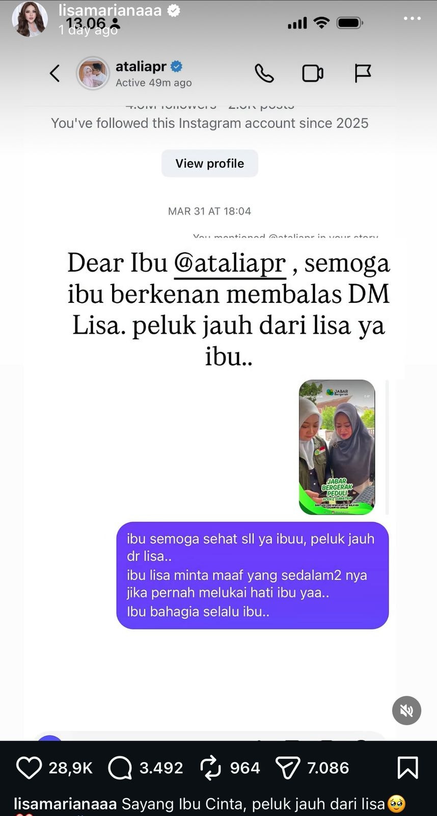 "Ibu semoga sehat sll ya ibuu, peluk jauh dr lisa.. ibu lisa minta maaf yang sedalam2 nya jika pernah melukai hati ibu yaa.. Ibu bahagia selalu ibu.." tulis Lisa pada Atalia Praratya melalui DM Instagram-nya, Rabu (17/12/2025).