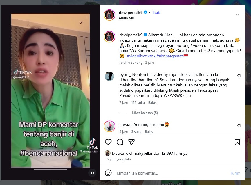 "Alhamdulillah..... ini baru ga ada potongan videonya, trimakasih mas2 aceh ini g gagal paham maksud saya ððð». Kerjaan siapa sih yg doyan motong2 video dan sebarin brita hoax ???? Komen ya gaes... ð. Ga ada angin tiba2 nyerang yg gak2 ð. #videolivetiktok #nkrihargamatið®ð©," tulis Dewi Perssik. (ND)