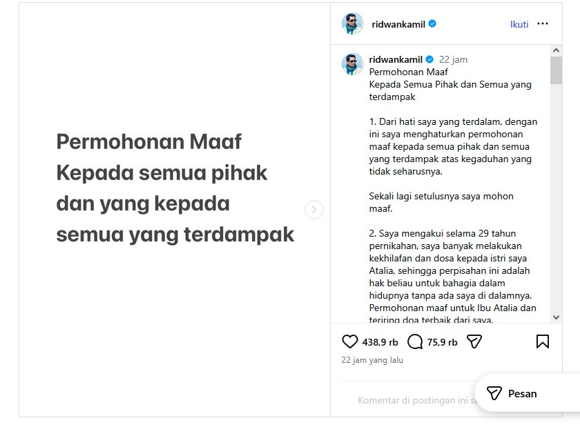 Melalui unggahan di Instagram miliknya, Ridwan Kamil menyampaikan permintaan maaf dan mengakui kalau dirinya khilaf. Dalam pernyataan tertulisnya, mantan Gubernur Jawa Barat itu juga mengakui telah melakukan banyak kekhilafan dan dosa kepada Atalia Praratya selama 29 tahun pernikahan mereka.