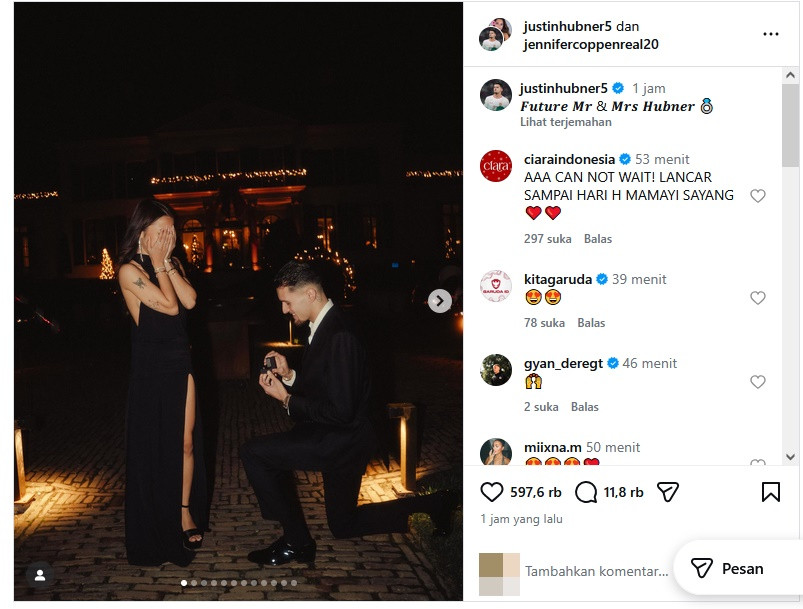 Dalam unggahan di Instagram miliknya, Justin Hubner memamerkan momen saat dirinya melamar Jennifer Coppen. Ada foto saat Justin tampak berlutut di hadapan Jennifer, hingga foto bersama putri Jennifer, Kamari.