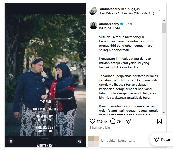 "Kami selesai. Setelah 14 tahun membangun kehidupan rumah tangga bersama, kami memutuskan, mengakhiri pernikahan dengan rasa saling menghormati. Keputusan ini tidak datang dengan mudah. Kami yakin, ini yang terbaik untuk kami berdua," tulisnya dalam caption. (ND)