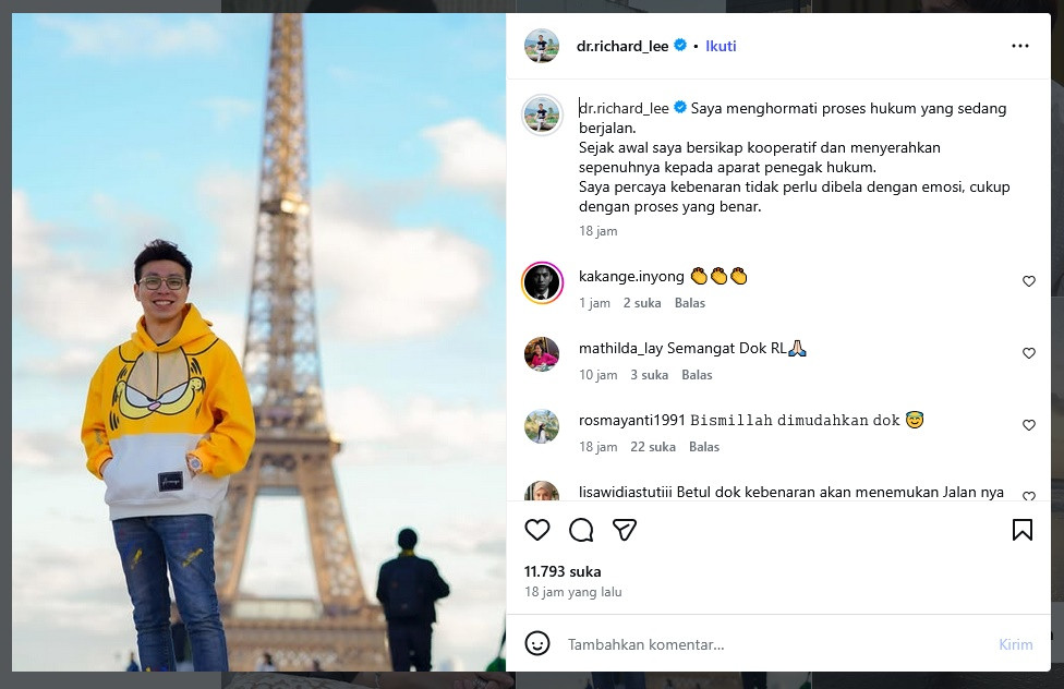 "Saya menghormati proses hukum yang sedang berjalan. Sejak awal saya bersikap kooperatif dan menyerahkan sepenuhnya kepada aparat penegak hukum," tulis Richard Lee.