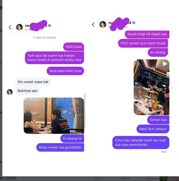 "Hallo kaaa. Tadi saya liat suami nya makan sama cewek di restoran seribu rasa. Saya aada bukti nyaa," kata warganet tersebut.