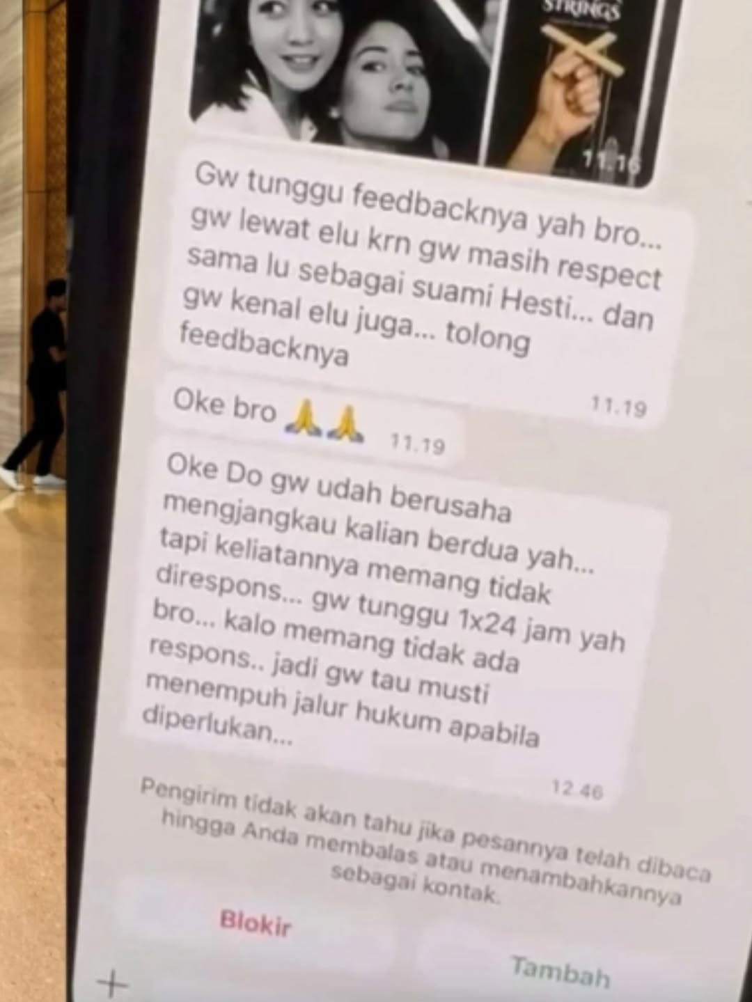 "Gw tunggu feedback-nya yah bro. Gw lewat elu karena gw masih respect sama lu sebagai suami Hesti, dan gw kenal lu juga, tolong feedback-nya," bunyi pesan orang tersebut.