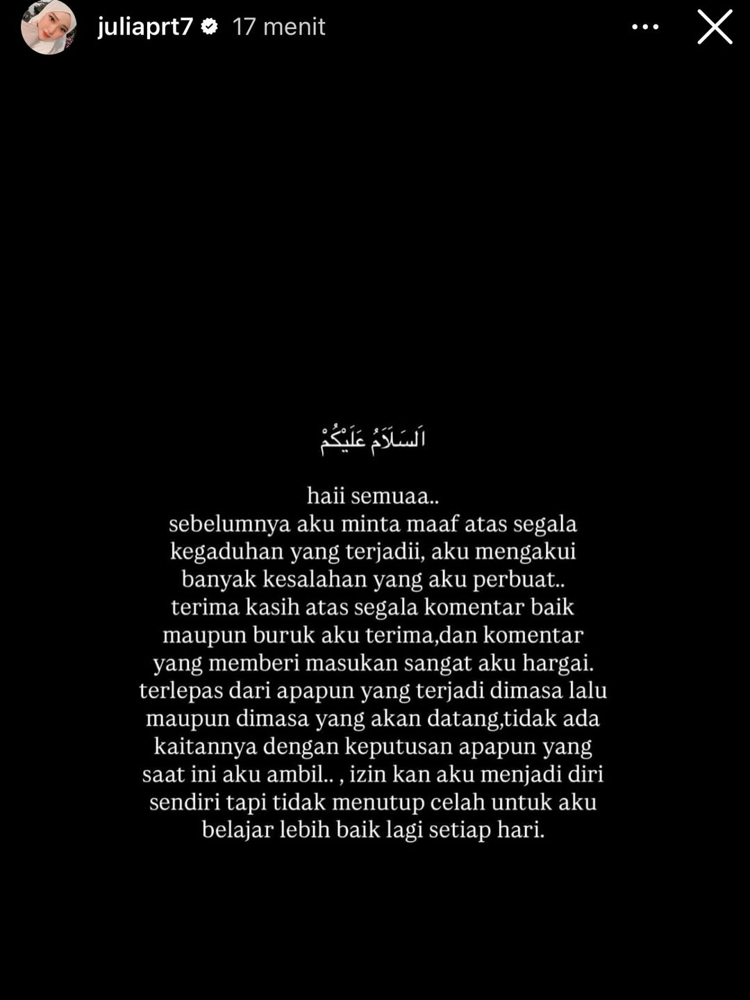 "Aku minta maaf atas segala kegaduhan yang terjadi. Aku mengakui banyak kesalahan yang aku perbuat. Terima kasih atas segala komentar baik maupun buruk yang aku terima, dan komentar yang memberi masukan sangat aku hargai,"kata Jule.