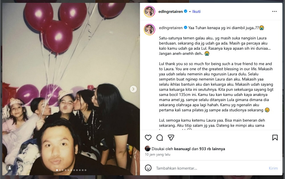 "Lul thank you so so much for being such a true friend to me and to Laura. You are one of the greatest blessing in our life. Makasih yaa udah selalu nemenin aku ngurusin Laura dulu. Selalu sempetin buat nginep nemenin Laura dan aku. Makasih yaa selalu ikhlas bantuin aku dan keluarga aku. Makasih udah sayang sama keluarga kita ini seutuhnya" tulis Greta Irene. (ND)
