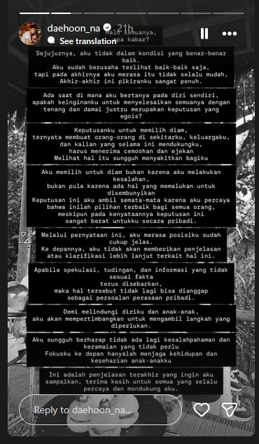 "Keputusanku untuk memilih diam, ternyata membuat orang-orang di sekitarku, keluargaku, dan kalian yang selama ini mendukungku, harus menerima cemoohan dan ejekan. Itu sungguh menyakitkan bagiku," tulis Na Daehoon di Instagram Story.