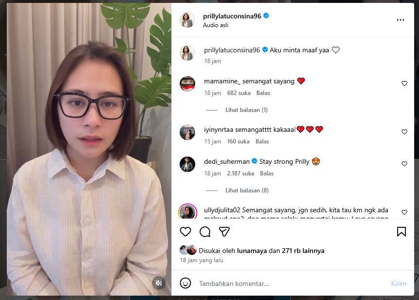 "Aku juga mengerti kenapa sebagian dari kalian marah, kecewa, atau nggak nyaman, untuk itu aku ingin menyampaikan klarifikasi dengan iktikad baik sebagai bentuk tanggungjawabku dalam berkomunikasi. Pertama-tama aku minta maaf dengan tulus kalau apa yang terjadi telah menimbulkan rasa nggak nyaman atau kesalahpahaman, " kata Prilly Latuconsina.