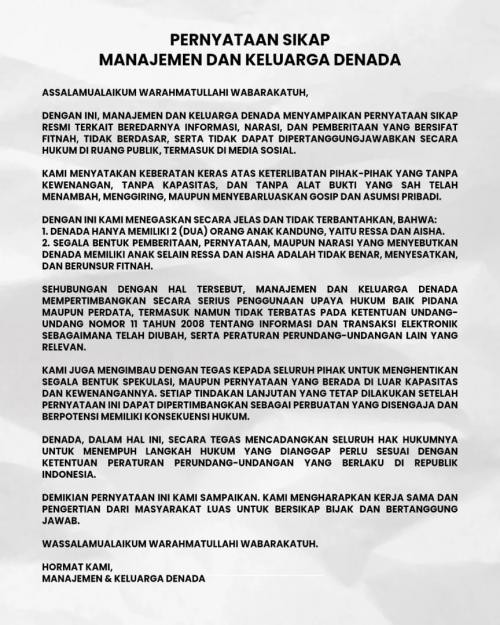"DENGAN INI KAMI MENEGASKAN SECARA JELAS DAN TIDAK TERBANTAHKAN, BAHWA: 1. DENADA HANYA MEMILIKI 2 (DUA) ANAK KANDUNG, YAITU RESSA DAN AISHA. 2. SEGALA BENTUK PEMBERITAAN, PERNYATAAN, MAUPUN NARASI YANG MENYEBUTKAN DENADA MEMILIKI ANAK SELAIN RESSA DAN AISAH ADALAH TIDAK BENAR," tulis pengumuman tersebut.