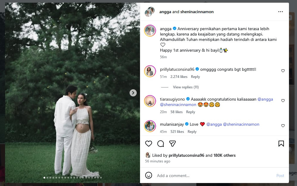 Dalam unggahan yang dibagikan, Angga dan Shenina kompak mengenakan pakaian berwarna putih. Selain merayakan ulang tahun pernikahan mereka, Shenina juga nampak memamerkan baby bump miliknya.