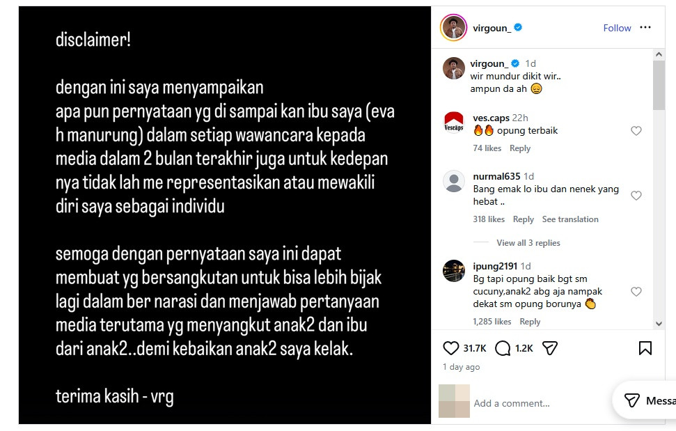 Sayangnya, melalui unggahan di Instagram miliknya, Virgoun membuat sebuah pengemuman mengejutkan yang menyeret sang ibunda. Ayah tiga anak itu meminta agar Eva Manurung untuk menahan diri memberikan komentar di media maupun podcast.