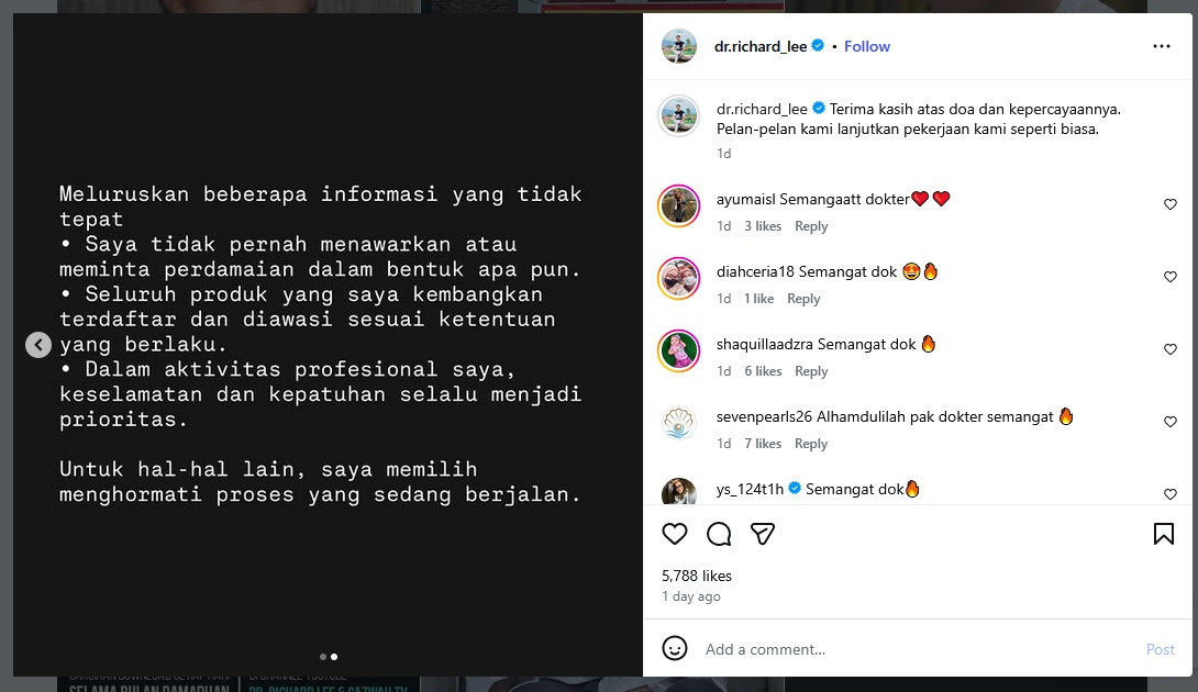 "Seluruh produk yang saya kembangkan terdaftar dan diawasi sesuai ketentuan yang berlaku. Dalam aktivitas profesional saya, keselamatan dan kepatuhan selalu menjadi prioritas," tegas Richard Lee.