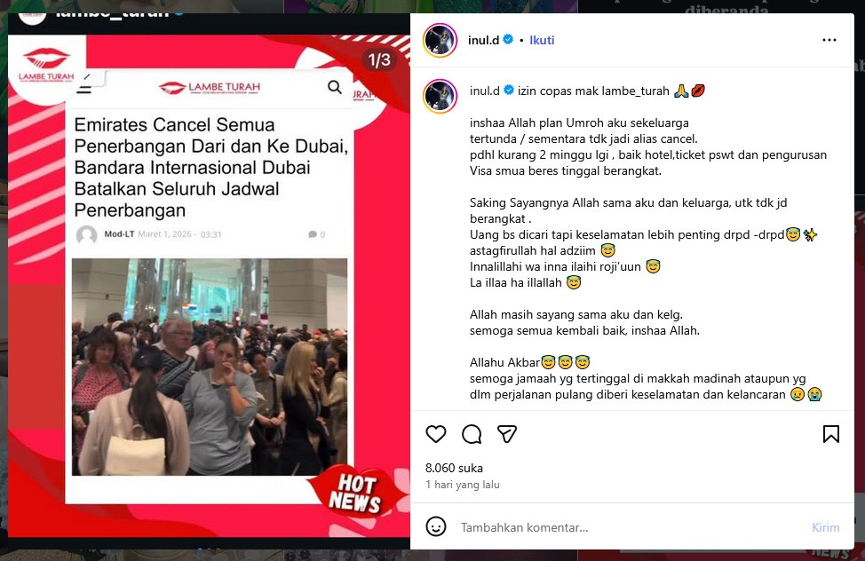 Kabar kurang menyenangkan belum lama ini dibagikan oleh Inul Daratista. Rencana untuk ibadah umrah bareng keluarga di bulan ini harus batal lantaran situasi geopolitik yang memanas setelah Israel dan Amerika Serikat bersekongkol menyerang Iran. Memanasnya kondisi cukup berdampak pada keamanan negara-negara sekitar.