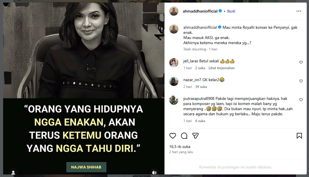 Dalam unggahan di Instagram miliknya, Ahmad Dhani menulis pesan bernada satir soal dilemma musisi untuk memperjuangkan hak royalti musik mereka. Sang musisi juga menampilkan foto jurnalis Najwa Shihab dengan kutipan yang menyinggung sikap terlalu sungkan, 'Orang yang hidupnya nggak enakan, akan terus ketemu orang yang nggak tahu diri'.