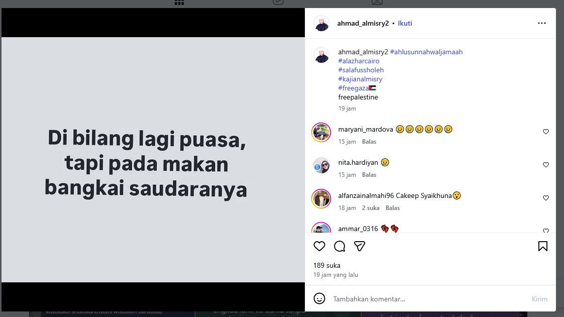 "Dibilang lagi puasa, tapi pada makan bangkai saudaranya," tulis Syekh Ahmad Al Misry dilihat pada Sabtu (14/3).