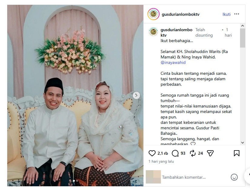 Dalam unggahan tersebut, Inayah Wahid tampil cantik dengan baju dan kerudung putih yang senada dengan Ra Mamak. Pernikahan itu juga banyak dihadiri oleh kebarat terdekat kedua mempelai. Unggahan itu pun mendapatkan banyak ucapan selamat dan doa dari masyarakat.