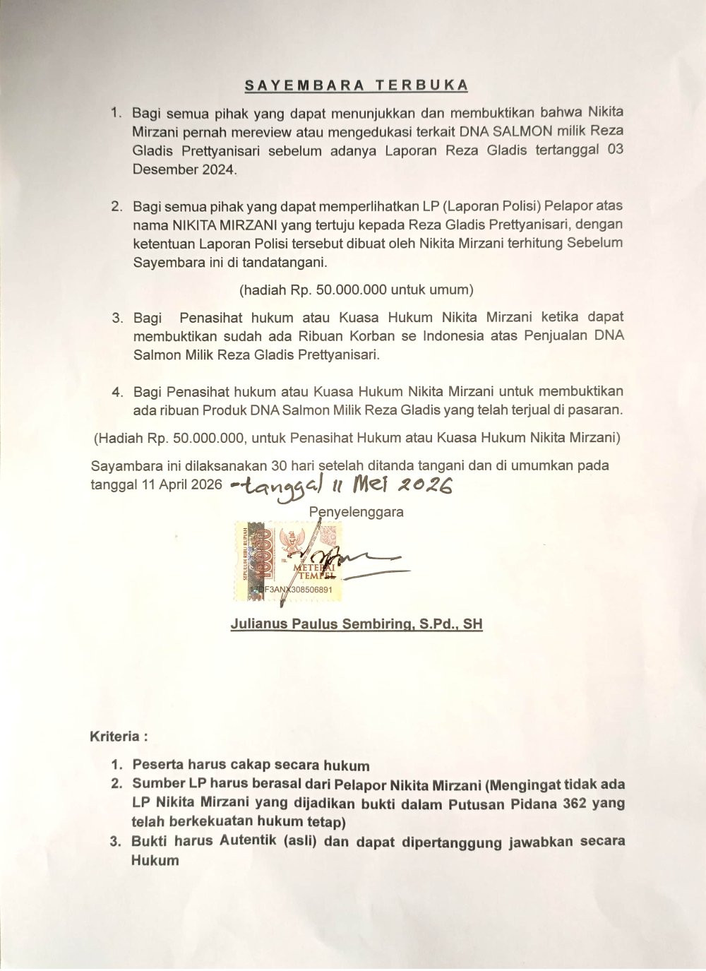 Bagi yang bisa membuktikan review dari Nikita Mirzani tersebut, Julianus Paulus Sembiring siap memberikan hadiah berupa uang Rp. 50.000.000 untuk umum Rp50.000.000 dan hadiah Rp. 50.000.000, untuk penasihat hukum atau kuasa hukum Nikita Mirzani. Sayambara ini dilaksanakan 30 hari, mulai tanggal 11 April 2026 â tanggal 11 Mel 2026 setelah ditanda tangani dan diumumkan. (ND)