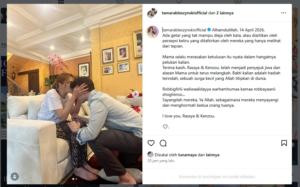 "Alhamdulillah, 14 April 2026. Ada getar yang tak mampu dieja oleh kata, atau diartikan oleh persepsi keliru yang ditafsirkan oleh mereka yang hanya melihat dari tepian," tulis Tamara Bleszynski.