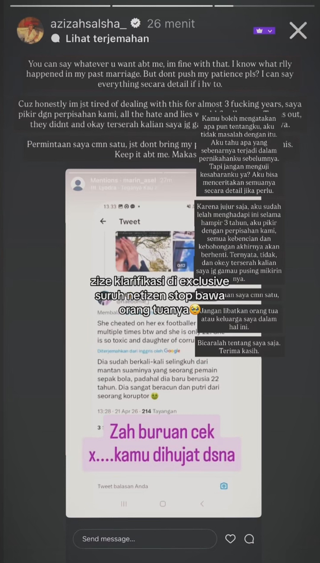 Walau begitu, Zize memberi peringatan jika sebaikanya netizen tidak menyinggung orang tuanya dalam masalah ini.