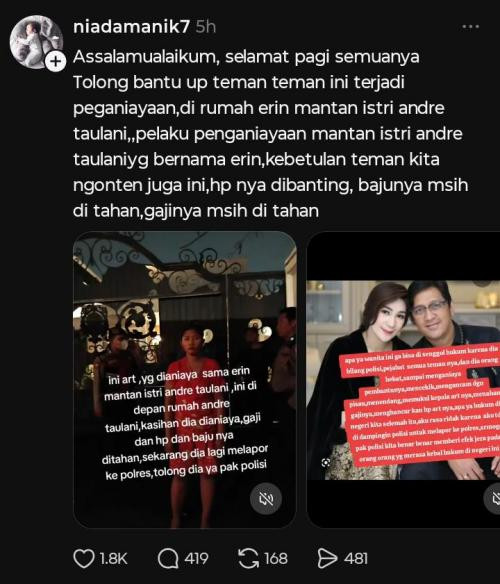 Unggahan itu dengan cepat viral dan menuai berbagai respon dari warganet. Terlebih usai akun Thread tersebut mengunggah foto Erin bersama mantan suaminya, Andre Taulany. Ada yang menyebutnya 'kebal hukum'. Hal ini yang membuat tidak sedikit warganet mendukung sang ART untuk melaporkan kejadian ini ke pihak kepolisian.