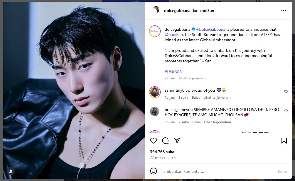 "Dolce&Gabbana dengan bangga mengumumkan bahwa San, penyanyi dan penari Korea Selatan dari ATEEZ, telah bergabung sebagai Global Ambassador terbaru," tulis penguman tersebut.