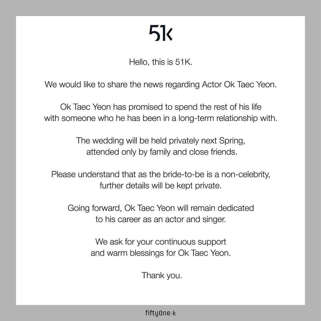 Kabar bahagia belum lama ini dibagikan oleh Ok Taecyeon yang secara resmi mengumumkan rencana pernikahan dengan kekasihnya. Diketahui kekasih Ok Taecyeon berasal dari kalangan non selebritis.