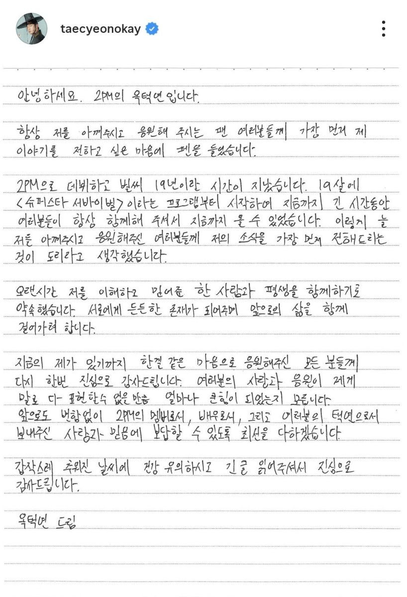 Menyusul pengumuman dari agensinya, Ok Taecyeon diketahui lantas mengunggah sebuah tulisan tangan. Dalam suratnya, anggota boy group 2PM itu menyapa penggemar dengan hangat dan menekankan bahwa dia ingin berbagi kabar ini lebih dulu kepada mereka yang selalu mendukungnya.