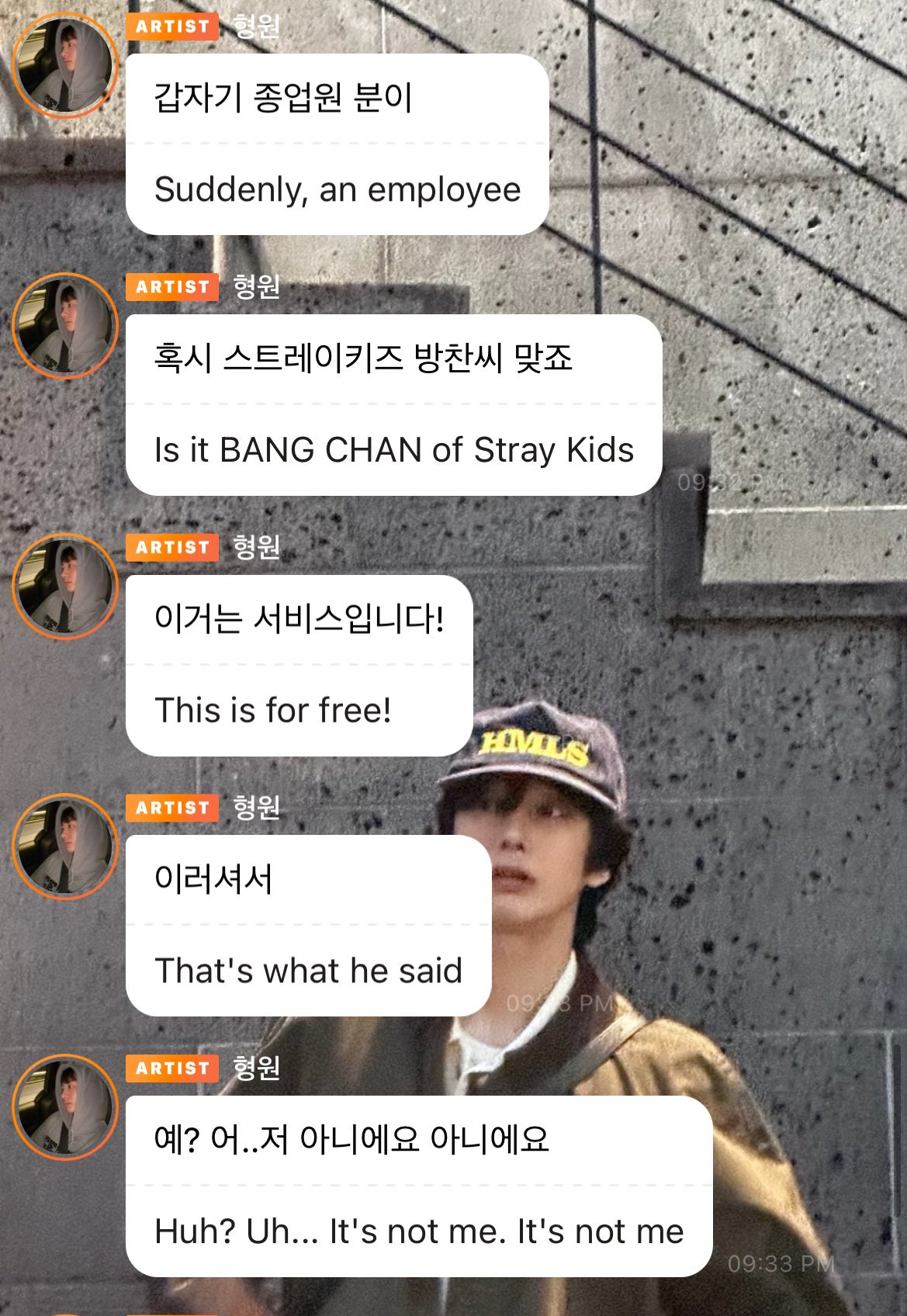 Dalam pesan yang dibagikan, Hyungwon bercerita belum lama ini makan di luar bersama temannya. Tiba-tiba meja idola 31 tahun itu dihampiri oleh seorang staff dan bertanya apakah dirinya adalah Bangchan sambil menawarkan sebuah makanan sebagai service (free).