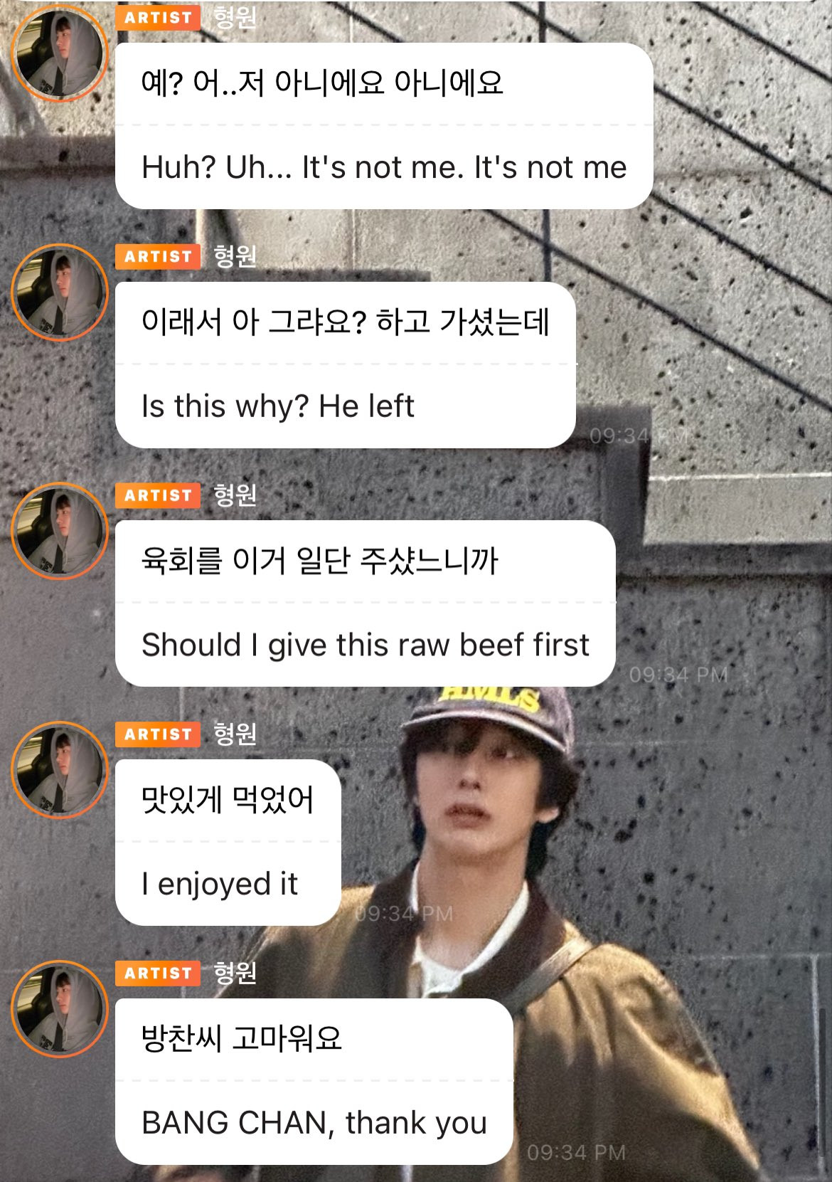 Meskipun Hyungwon berkata bahwa dirinya bukan Bangchan, namun pelantun lagu Beautiful Liar itu tetap mendapatkan makanan gratis dari restoran tersebut. Oleh karena itu, melalui pesan tersebut, Hyungwon ingin mengucapkan terima kasihnya kepada Bangchan karena dirinya mendapatkan makanan gratis.