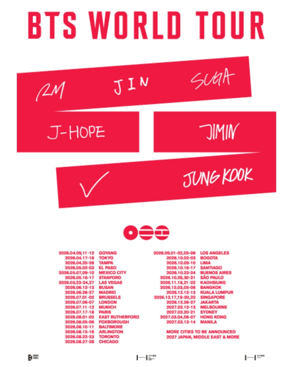 Melalui akun media sosial resminya, BTS resmi mengumumkan rangkaian konser tur yang akan dimulai pada 9â12 April 2026 di Goyang, Korea Selatan. Setelahnya, artis naungan HYBE MUSIC itu akan melanjutkan tur ke berbagai kota besar di Asia, Amerika, Eropa, hingga Amerika Latin.