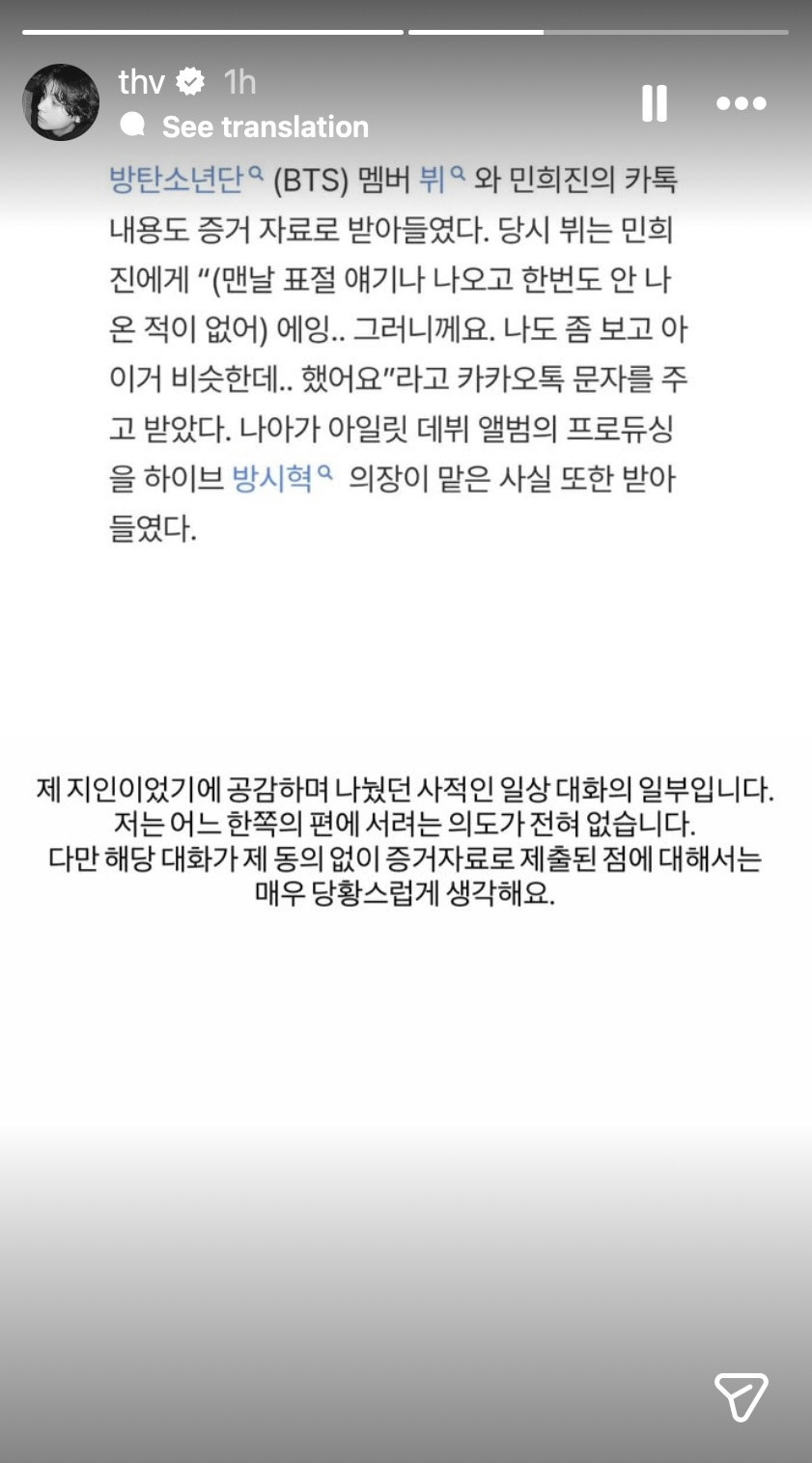 Menanggapi hal ini, V melalui Instagram miliknya memberikan klarifikasi. Dengan membagikan tangkapan layar, V menjelaskan bahwa percakapannya dengan Min Hee Jin terjadi lantaran rasa empati karena keduanya saling mengenal. Selain itu, dia juga menegaskan bahwa percakapan tersebut tidak berarti memihak salah satu pihak.
