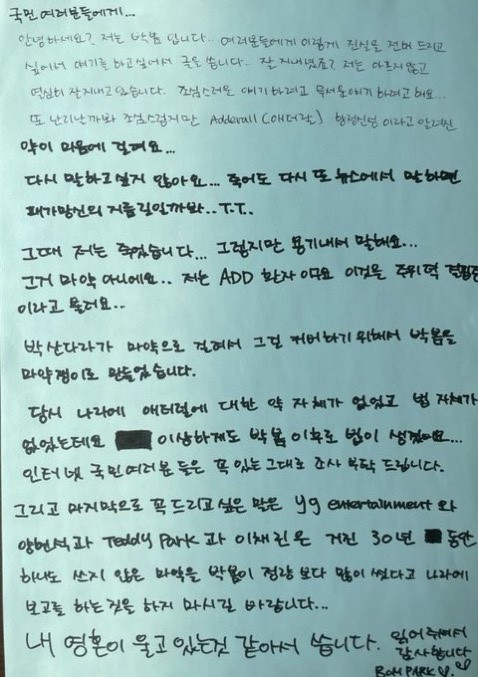 "Saya adalah pasien ADD, dan untuk menutupi kasus penyalahgunaan narkoba yang menimpa Sandara Park, mereka mengubah masalah pengobatan menjadi sesuatu yang dilabeli sebagai skandal narkoba yang melibatkan saya,"tulis Park Bom.