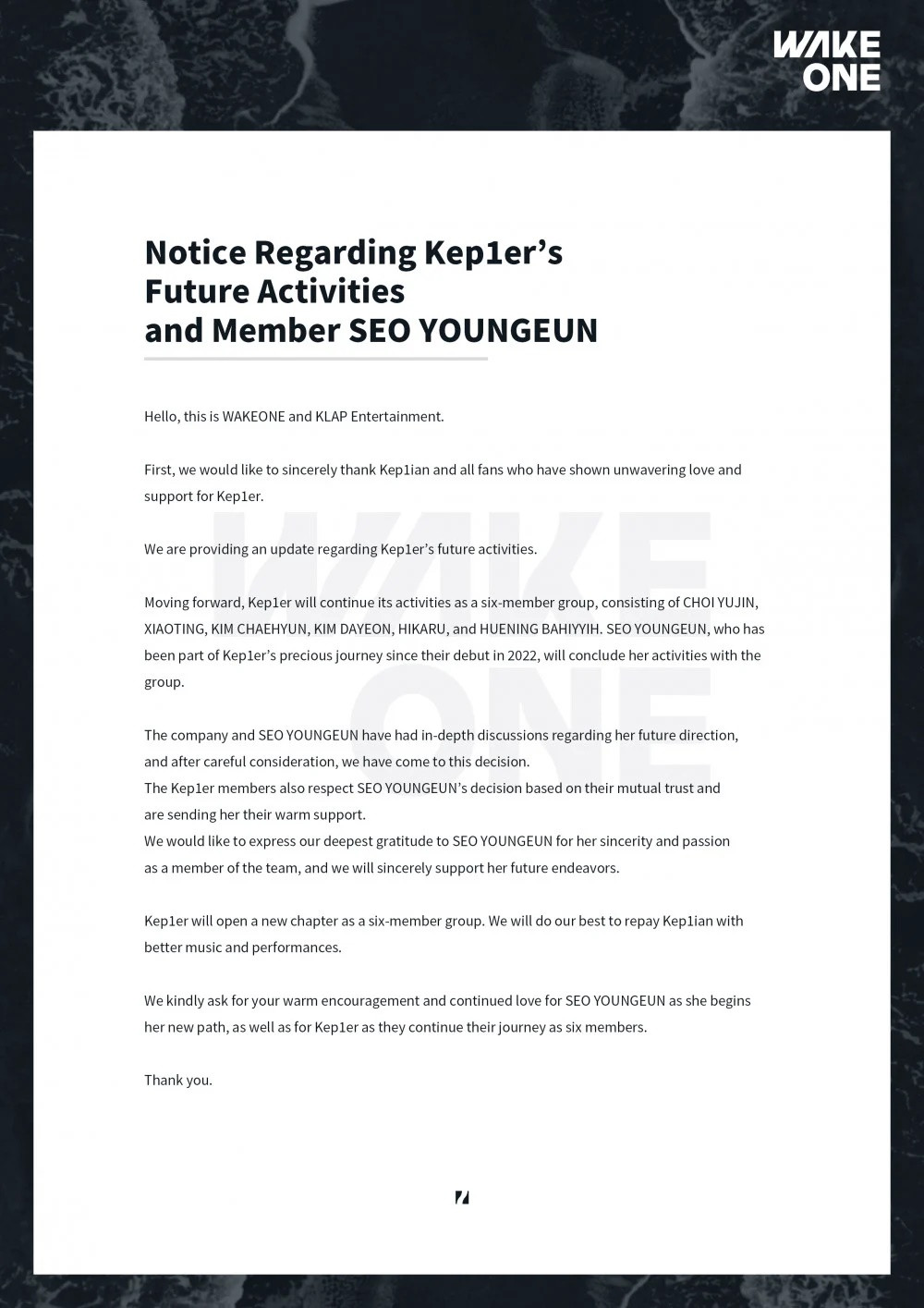 Dalam pengumuman yang dibagikan, disebutkan bahwa girl group Kep1er akan melanjutkan aktivitas dengan enam orang yang terdiri dari Choi Yujin, Xiaoting, Kim Chaehtun, Kim Dayeon, Hikaru dan Huening Bahiyyih. Sementara Seo Youngeun, yang telah menjadi bagian dari perjalanan berharga Kep1er sejak debut pada tahun 2022, akan mengakhiri aktivitasnya bersama grup tersebut.
