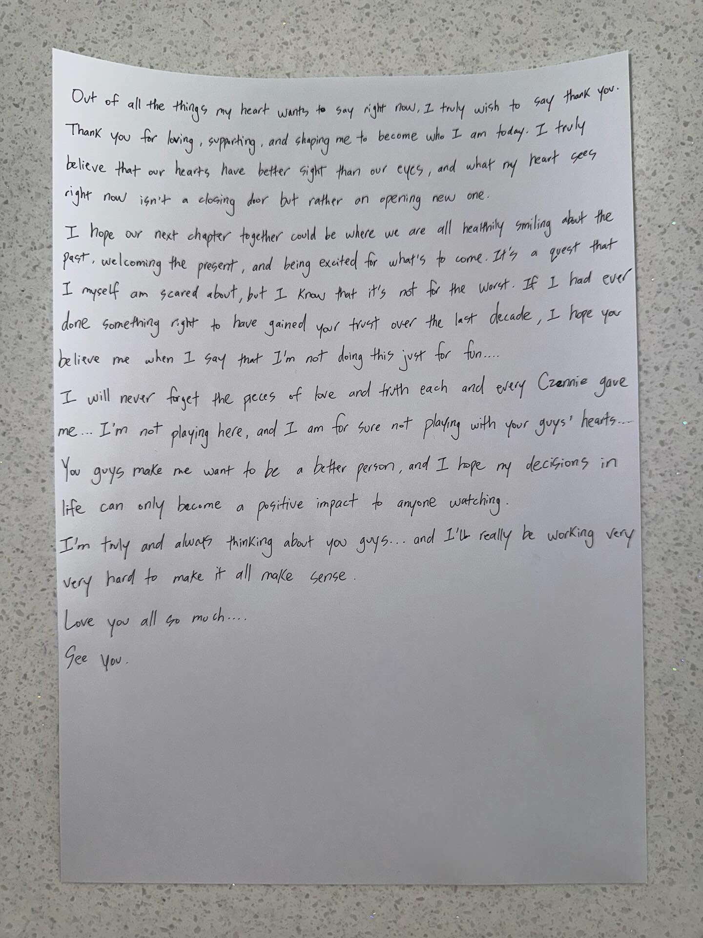 Menyusul pengumuman tersebut, Mark Lee kemudian mengunggah surat tulisan tangan di akun Instagram miliknya. Dalam surat tersebut, Mark mengungkapkan rasa terima kasih yang mendalam kepada para penggemar (Czennie) yang telah mendukung dan membentuk dirinya selama ini.