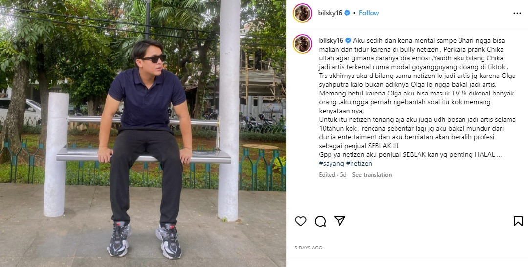 Billy pun menutup pesan ini dengan mengumumkan niatnya untuk gantung sepatu dari dunia hiburan. Selain itu, Billy juga membeberkan profesi apa yang akan didalaminya pasca pensiun nanti, yaitu berjualan seblak.