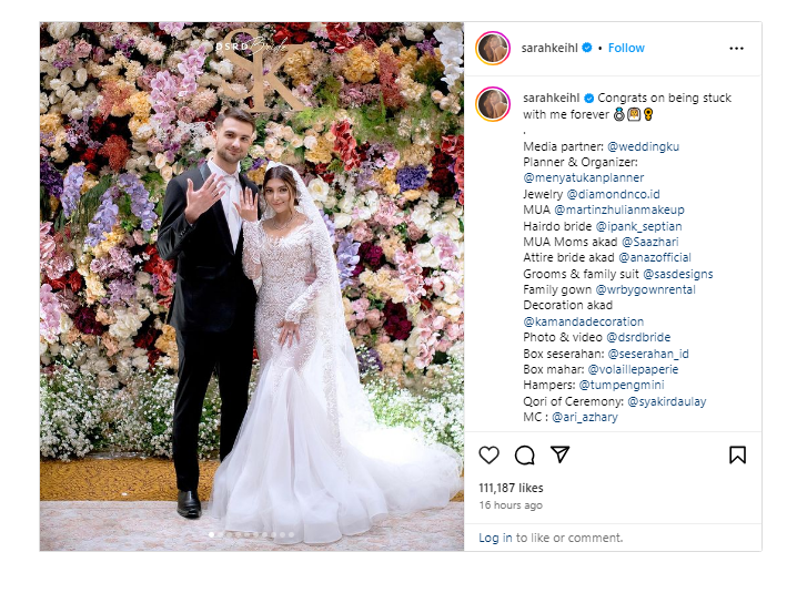Selebgram yang terkenal dengan gaya hidup mentereng serta wajah cantik rupawan, Sarah Keihl akhirnya resmi menjadi seorang istri dari bule asal Jerman bernama Kilian Potter. Sarah Keihl dipersunting dengan mahar senilai 13.000 euro atau senilai Rp 222 juta. Pernikahan Sarah Keihl dan Kilian Potter digelar di JW Marriott Hotel, Sabtu (27/1/2024). Kilian Potter mengaku gugup karena tidak begitu paham dengan tradisi pernikahan di Indonesia.